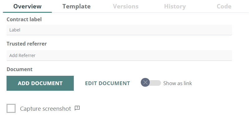 - Document: This document will be displayed only in the snippet (e.g.: Privacy Policy document). Note that this is not the contract document; the contract document is uploaded in the Template tab.
