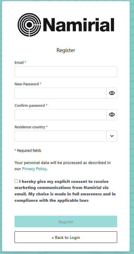 If you don't already have an account, you have to click on "register" and insert your data to create a MyNamirial account.