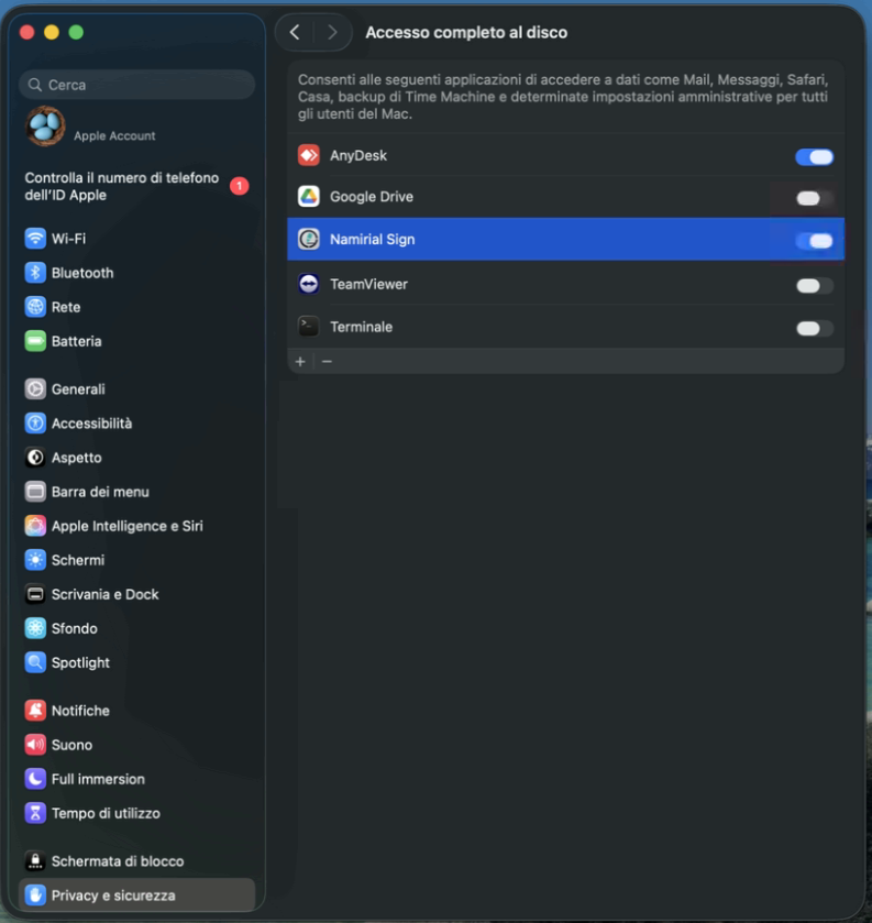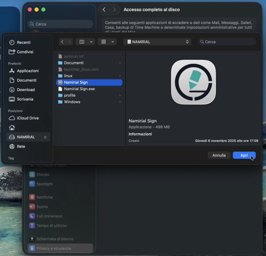 Starting from MacOS 26 Thaoe, you need to grant full disk access permissions to correctly use Namirial Sign with a USB token (Portable version).