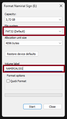 - Click Start to begin formatting.