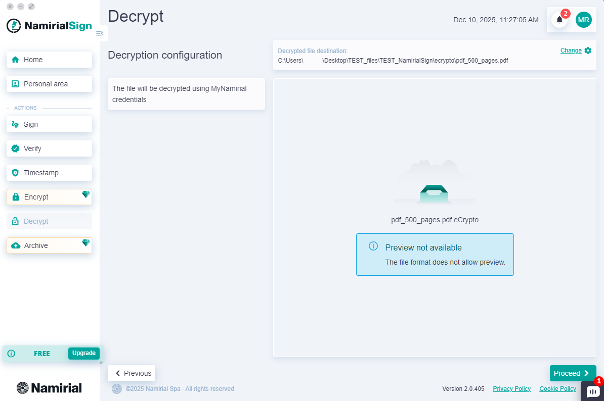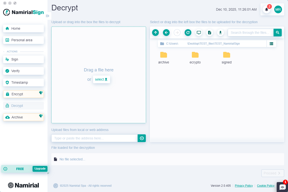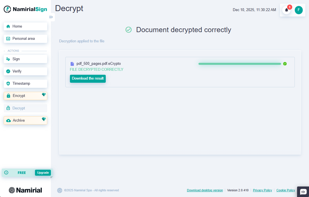 On Namirial Archive, it is possible to store documents with compliant preservation and encryption. You may need to decrypt files encrypted with the .ecrypto extension to view their contents. To do this, you must first download the .ecrypto file from Namirial Archive and then decrypt it with Namirial Sign.