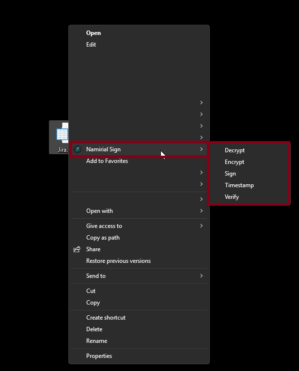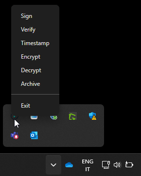Namirial Sign allows you to perform signing, verification, timestamping, encryption, decryption, and archiving operations quickly directly from some shortcuts.
