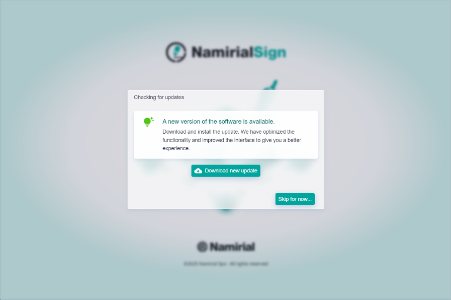 Namirial Sign has an update feature: at each startup, the application checks for new versions and, after user authorization, performs the update. If a mandatory update is present, the user must perform it to continue using the software.