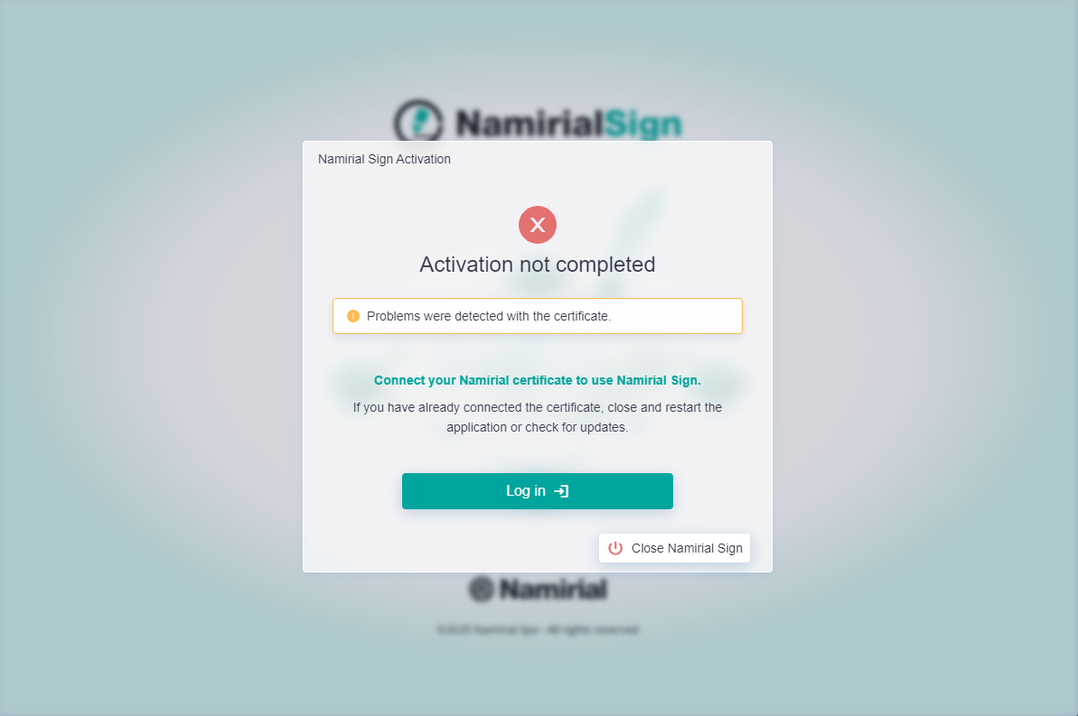 The portable version of Namirial Sign can be activated without logging into the system, if installed on a Namirial token with Namirial certificates onboard. During startup, this check is performed, and if certificates are found, it can be used without login but with some limitations detailed below. If the certificates are not found, activation of the portable version is not possible and login to MyNamirial is required as indicated in the "Login to MyNamirial" paragraph.