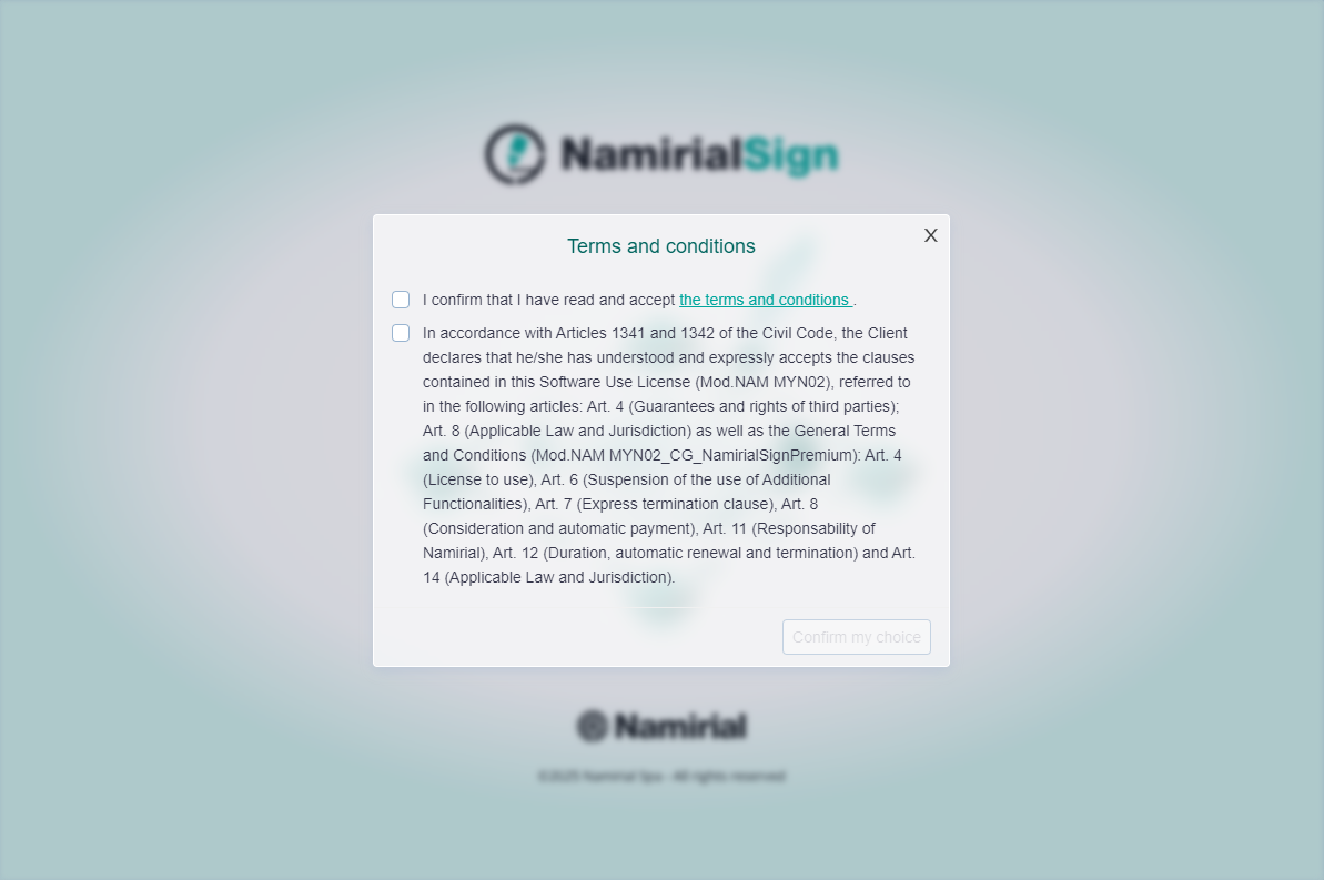 To access the features of Namirial Sign, you must register and authenticate to MyNamirial. The software will prompt for authentication by opening a page where you can register (if not already done) or enter your credentials. Once logged in, Namirial Sign will validate the authentication and proceed to the next step.