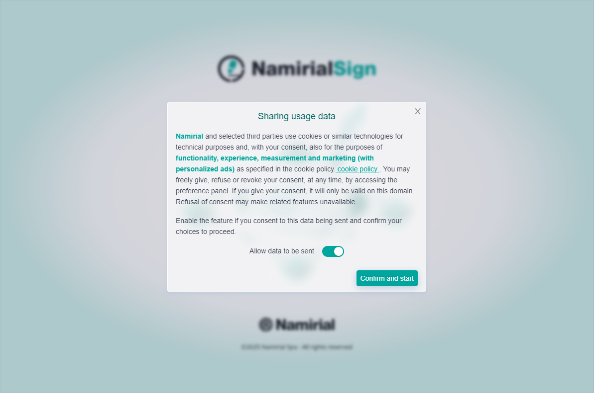 After activating the portable version or authenticating to MyNamirial, the license check for Namirial Sign will be performed. If the software is used for the first time, you will be asked to accept the license agreement and then the sharing of anonymous data to improve future development of the application.