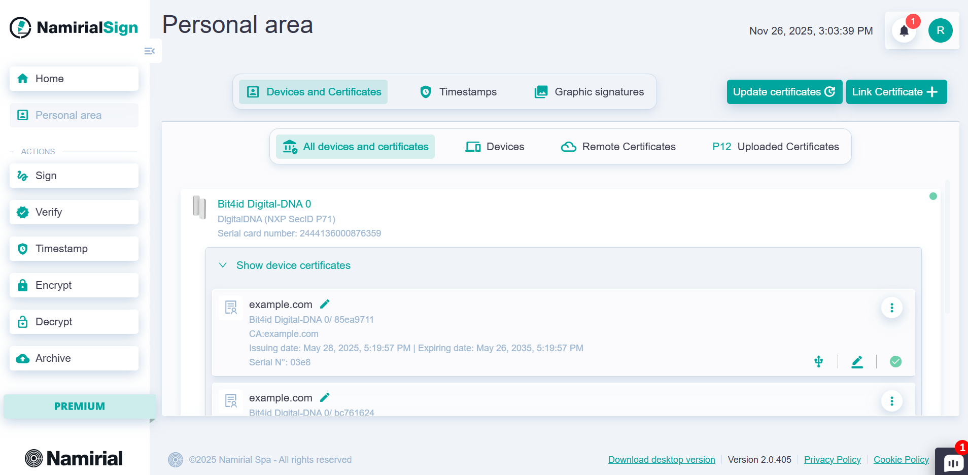 In addition to the previous signature certificates, you can view local certificates, i.e., those present on a physical device (smartcard or token). No interaction with the software is necessary, just insert the token into the PC or the smartcard into a reader and all certificates on board will be automatically displayed.
