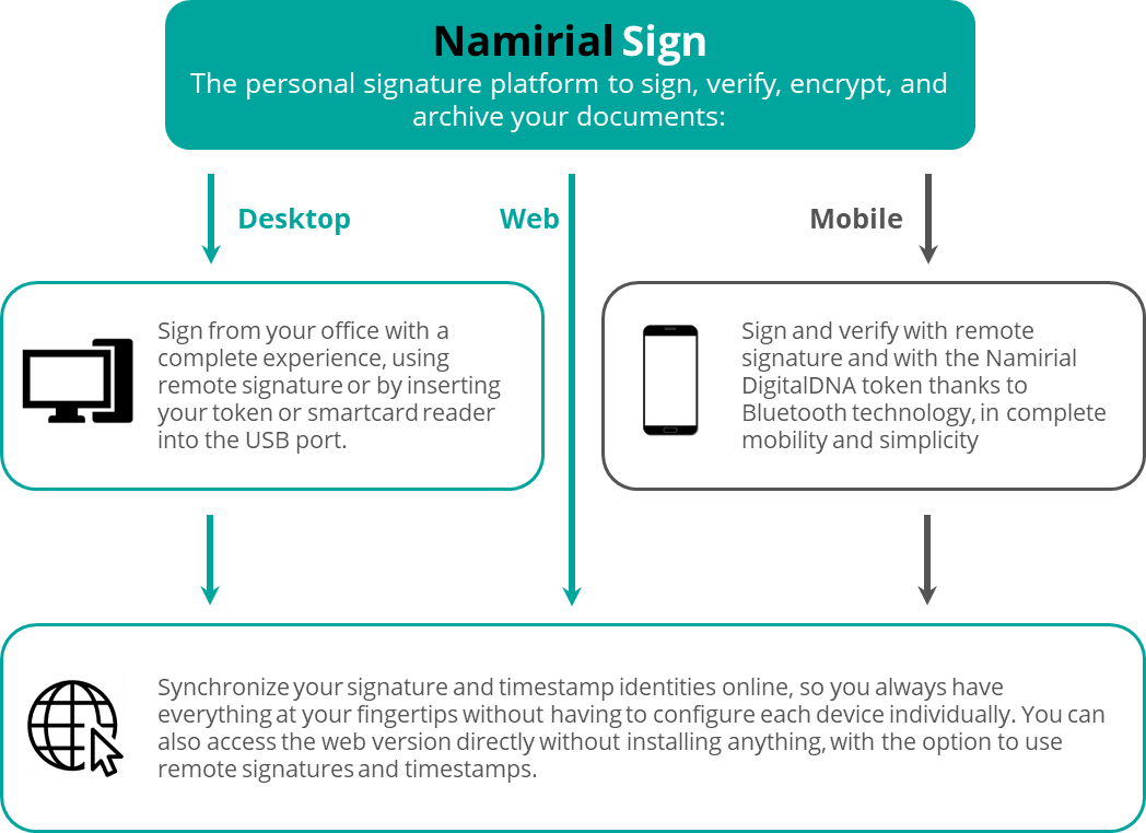 With our solution, you have complete freedom to choose how you sign: from traditional smart card readers, smartcards, and tokens, to modern remote signatures, ideal for mobile workers while remaining compliant with current regulations. And if you sign from a PC, you can rely on local certificates.