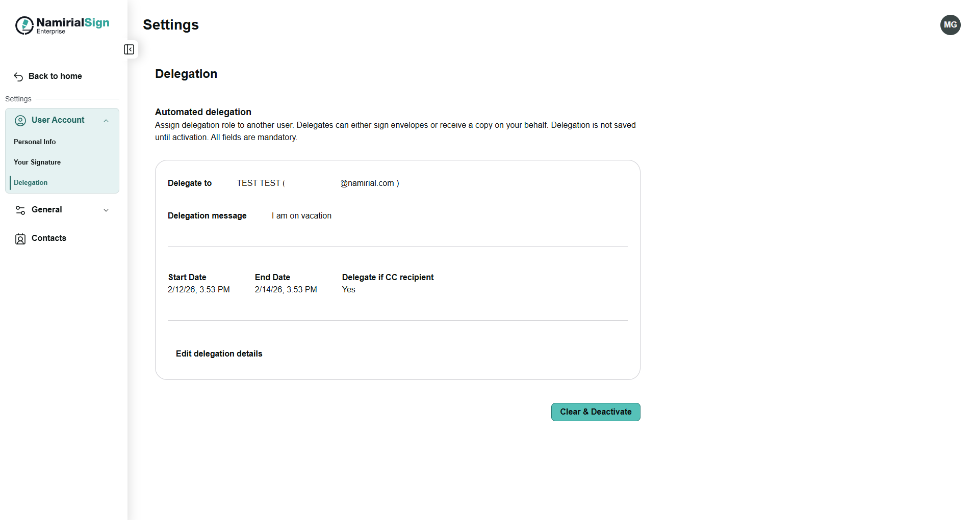 After clicking on activation a summary of the configured delegation will be displayed as well as the possibility to edit or to deactivate the delegation.