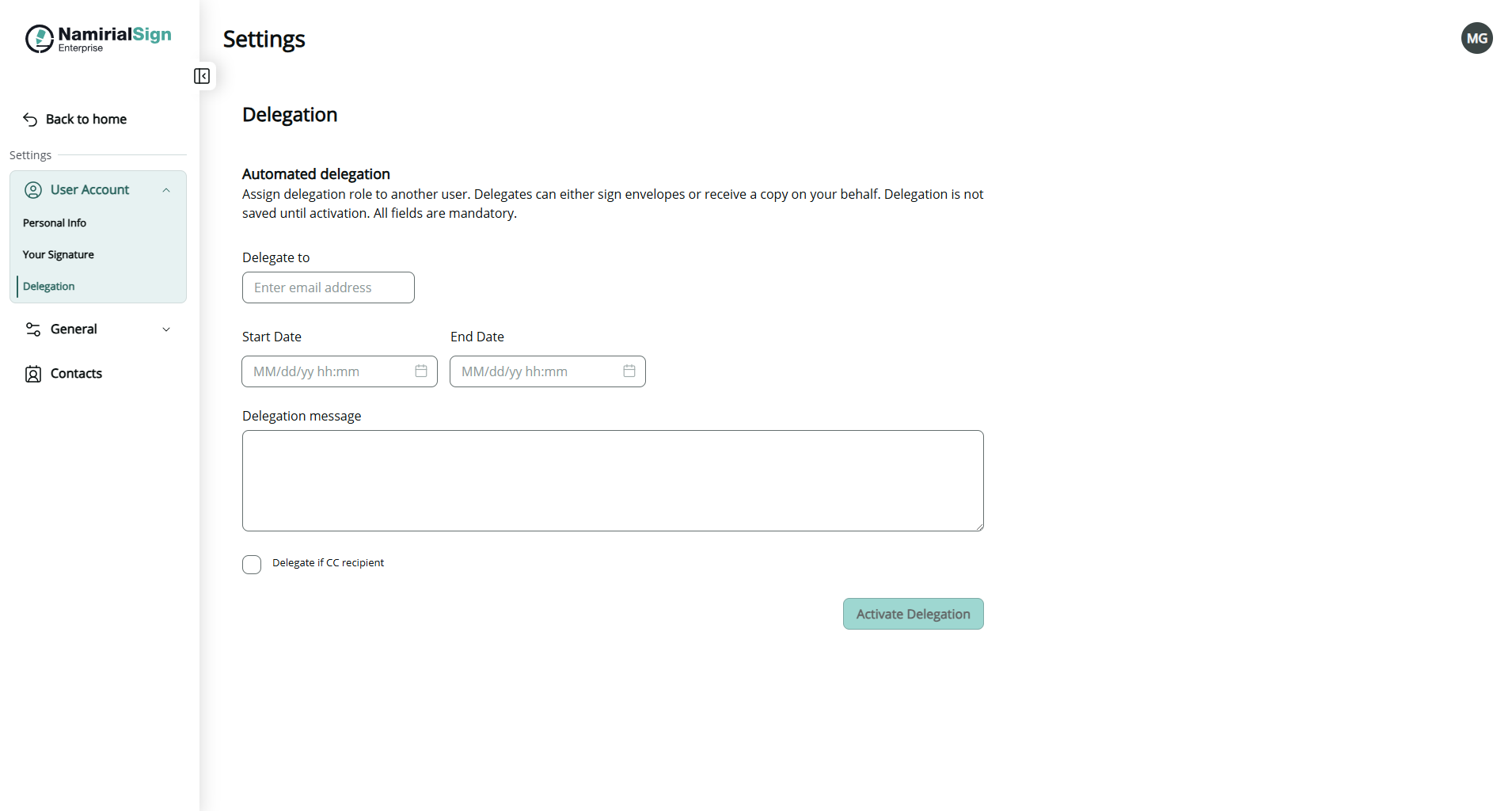 - Enter the email address to the one who should receive the envelopes on your behalf (delegatee must be a user within the organization)